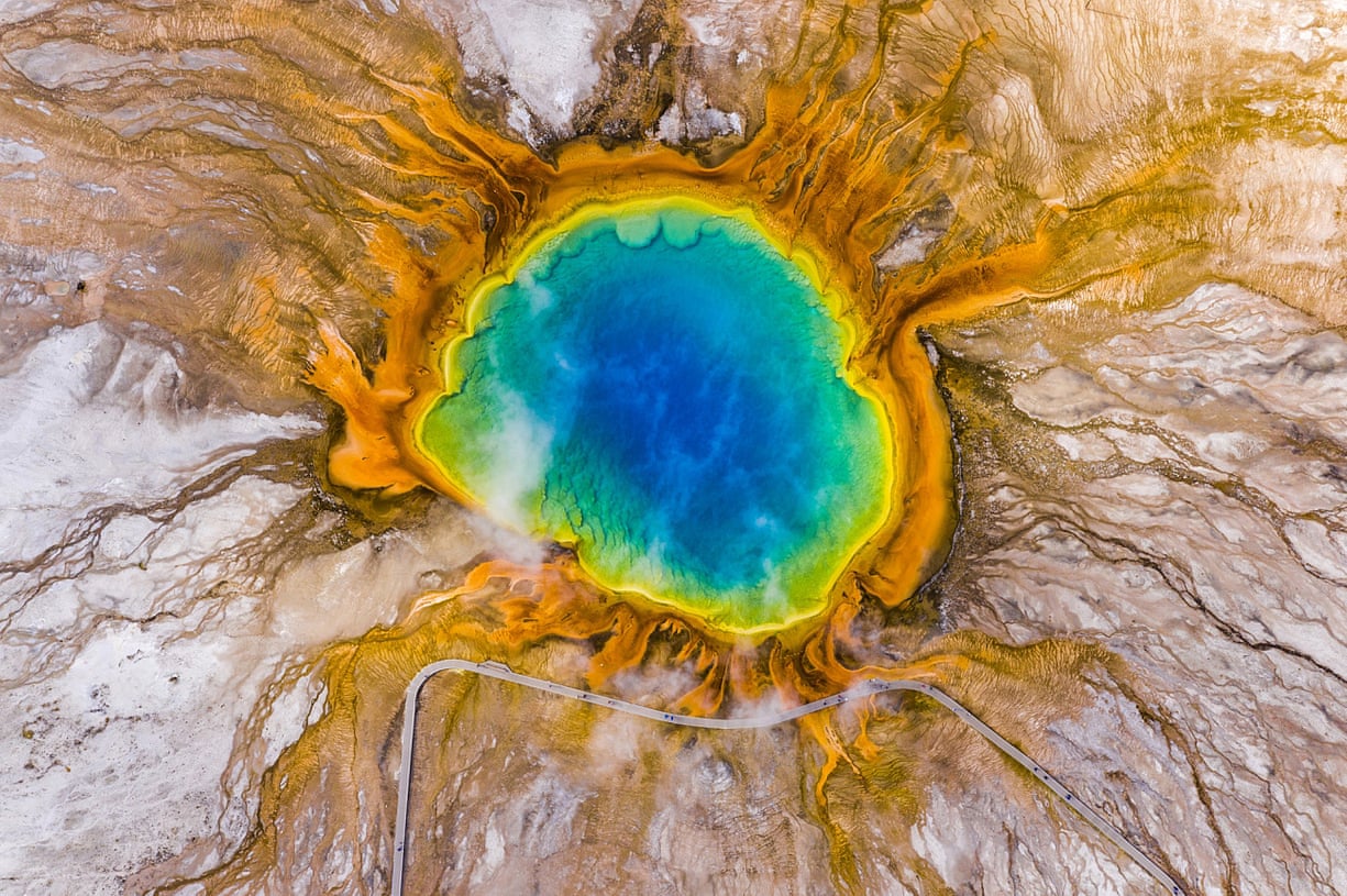 Mirror of the Land, una impactante foto aérea de Grand Prismatic Spring en Yellowstone, la fuente termal más grande de los Estados Unidos y la tercera más grande del mundo.