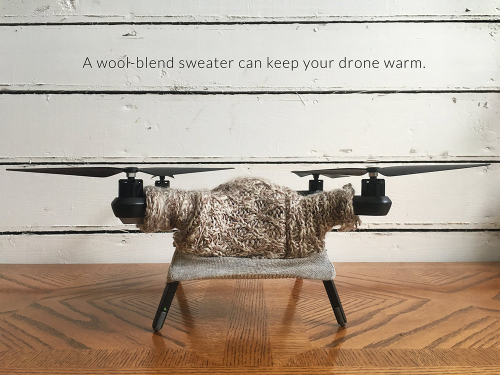 "Los propietarios de aviones no tripulados en climas fríos me han dicho que sus aviones no tripulados tienen problemas con la duración de la batería durante el invierno", dijo. "Estaba pensando que debo añadir bolsillos en los suéteres que puedan contener calentadores portátiles, o hacer el suéter eléctrico por lo que mantendría al drone a una temperatura más cálida. En realidad esto sería útil, no sólo por la novedad".