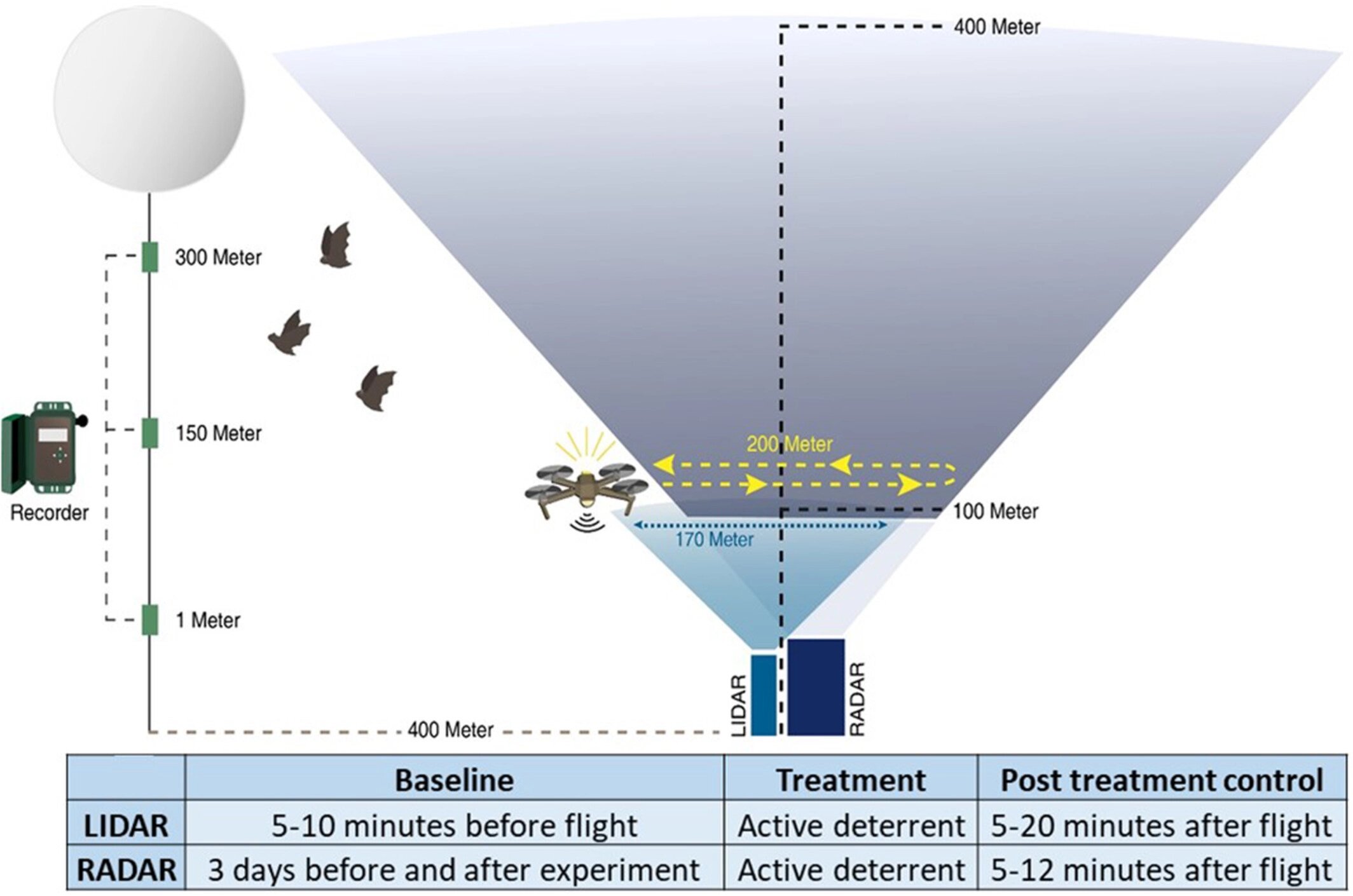 Imagen: Configuración del experimento: El disuasivo activo se voló a 100 m sobre el nivel del suelo en transectos horizontales de 200 m cerca y fuera de los volúmenes de detección de RADAR y LIDAR. LIDAR documentó la actividad por debajo de la altitud de vuelo del elemento disuasorio y el RADAR la documentó por encima de la altitud de vuelo. Se lanzó un aerostato fuera y cerca del borde del volumen de detección del RADAR con la matriz acústica vertical desplegada en su correa, registrando la actividad de los murciélagos.