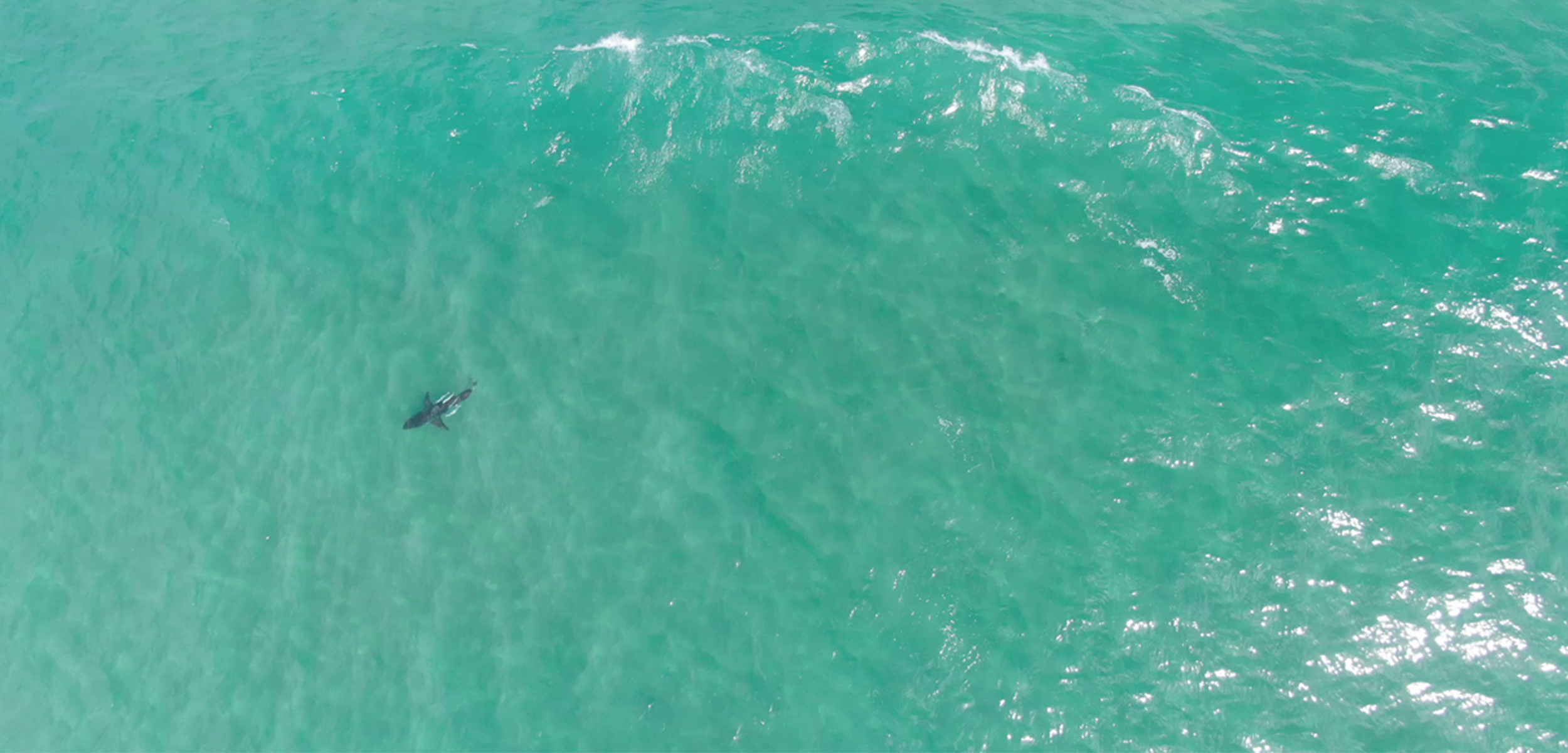 Imagen: Los tiburones pueden ser fáciles de detectar desde un dron, aunque se vuelve más difícil en condiciones adversas. Foto cortesía del Departamento de Agricultura y Pesca de Queensland