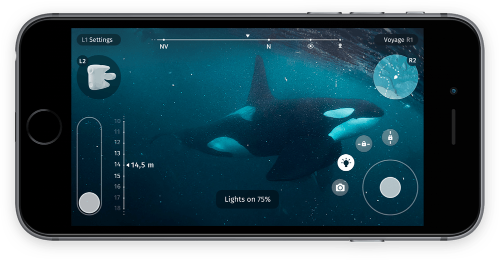 El sumergible tiene un delgado cable de comunicaciones que llega hasta una boya que es remolcada en la superficie, y esa boya utiliza Wi-Fi para comunicarse con una aplicación Android/iOS en el smartphone o tableta del usuario seguro y seco (siempre y cuando el usuario esté a 30 m / 98 pies de la boya). Utilizando la aplicación, pueden controlar el drone en tiempo real, y ver/grabar lo que está viendo su cámara de gran angular de 1080p/30fps.
