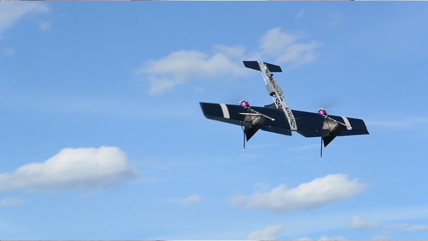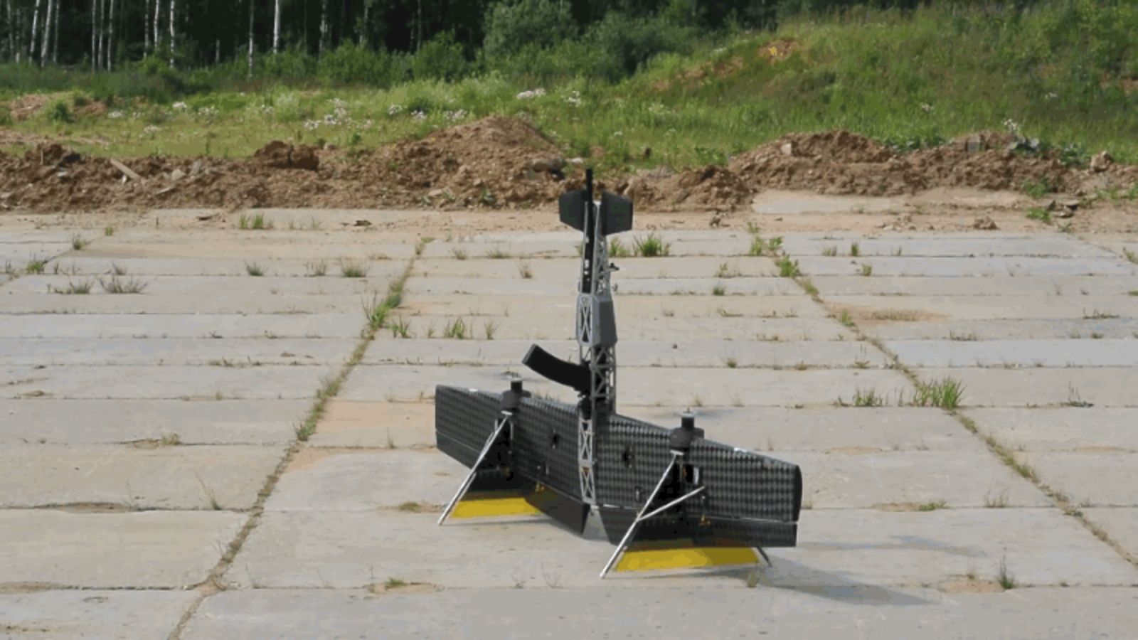El avión no tripulado posado sobre la cola despega en el lugar, pero vuela como un avión para una mayor eficiencia, lo que le da un rango de 40 minutos mientras va provisto de una escopeta Vepr-12 totalmente automática con un cargador de 10 balas.